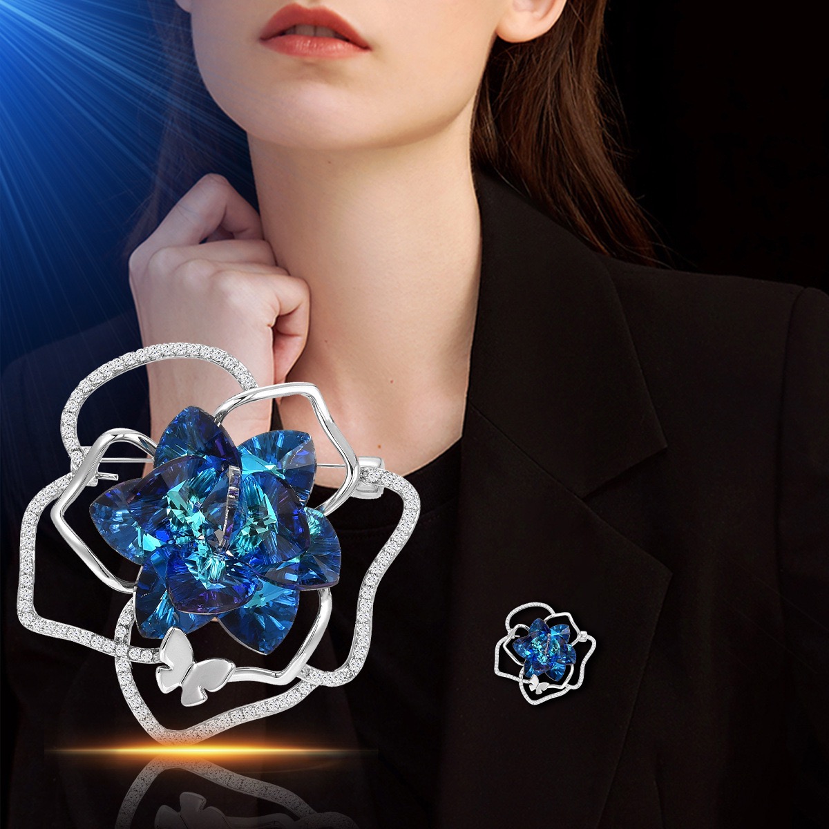 At the Heart of the Jacket, a Delicate Brooch Captures Curious Eyes. With its Metallic Curves and Sparkling Stones, it is Not Just an Accessory — it is a Statement of Style, Elevating Everyday Life into a Runway of Sophistication and Unique Personality.