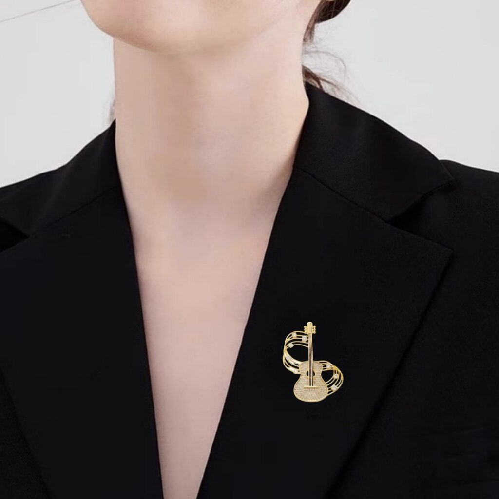 At the Heart of the Jacket, a Delicate Brooch Captures Curious Eyes. With its Metallic Curves and Sparkling Stones, it is Not Just an Accessory — it is a Statement of Style, Elevating Everyday Life into a Runway of Sophistication and Unique Personality.