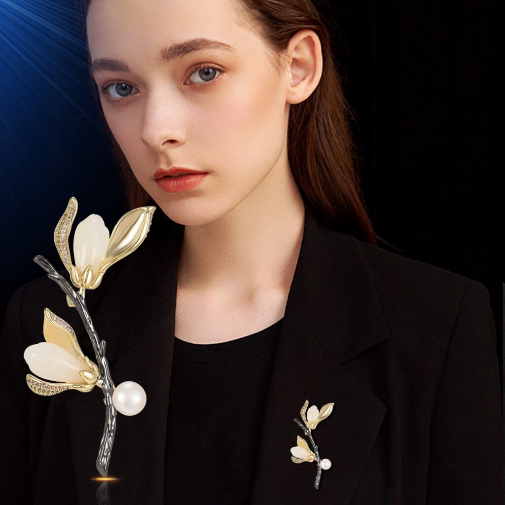 At the Heart of the Jacket, a Delicate Brooch Captures Curious Eyes. With its Metallic Curves and Sparkling Stones, it is Not Just an Accessory — it is a Statement of Style, Elevating Everyday Life into a Runway of Sophistication and Unique Personality.